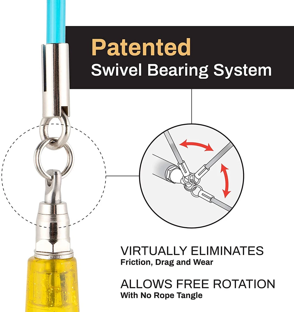 - Patented Swivel Bearing System technically engineered for eliminating friction, drag, tangling and allows smooth turning action in all directions.