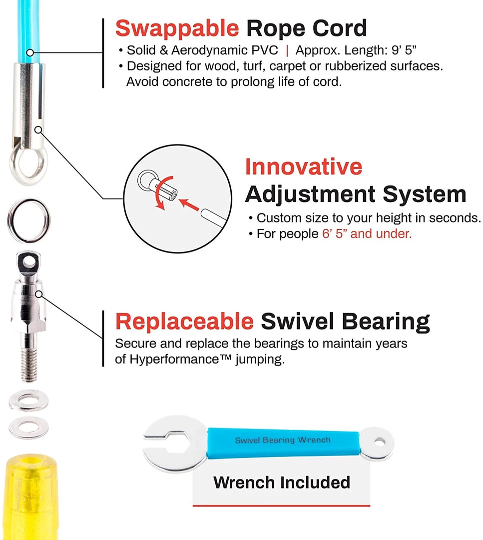 - Innovative Adjustment System allows you to custom size the rope for your height in seconds.