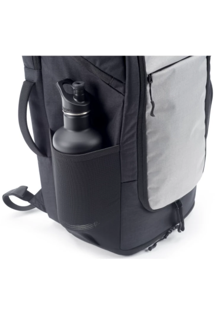 Zippered left side pocket & stretch mesh right side water bottle pocket