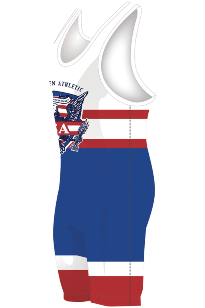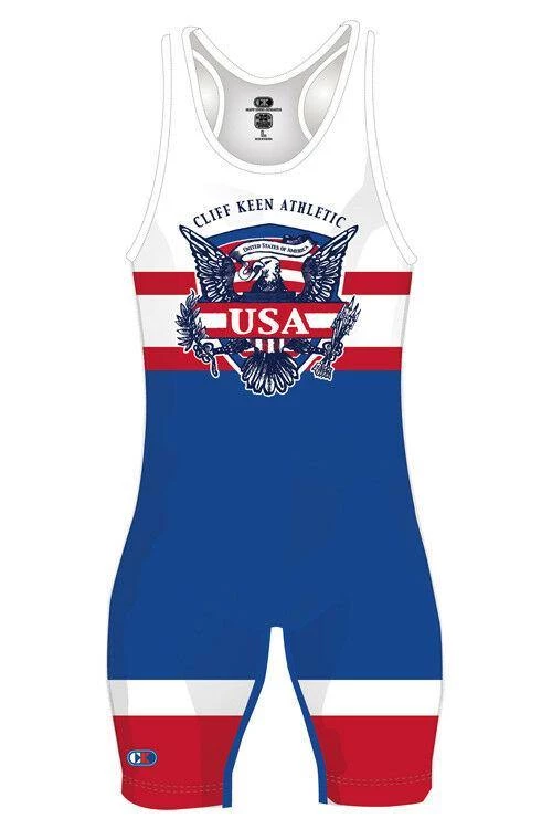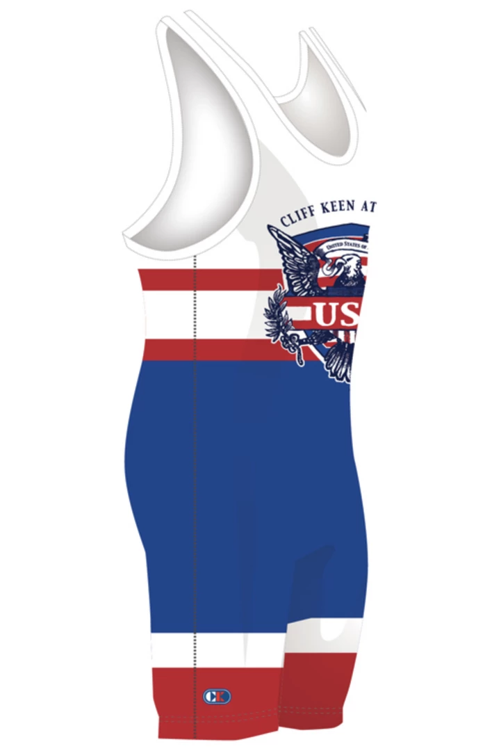 Our extremely popular dye sublimation puts you in the driver’s seat. Featuring Cliff Keen’s exclusive Compression Gear fabric, Compression band leg cuffs, and our Sublimated Stretch Mesh Panel! Stamped with our brand new Historic Eagle logo on the chest along with a patriotic bold “USA” font on the back, get on the mat and show off your wrestling style with this newly designed signature singlet! Everybody in the stands will know you are a beast with this singlet on!
