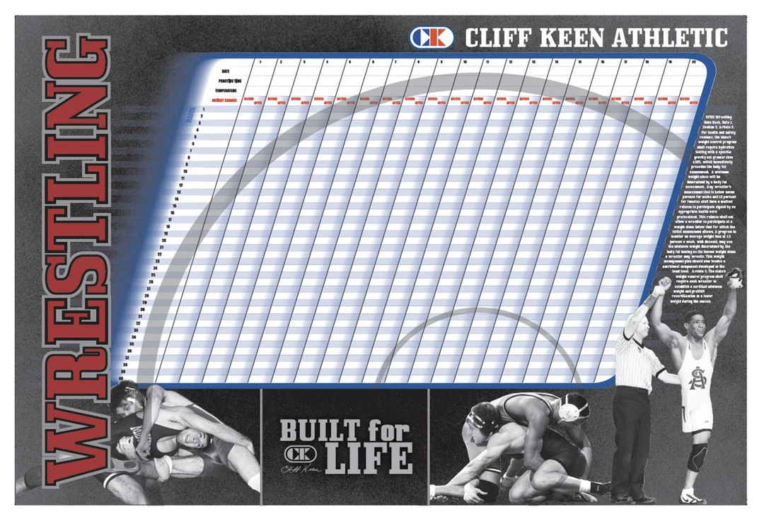 The first weight chart specifically designed for Wrestling. New design and updated weight facts! ย Double sided. 24″ x 36″.