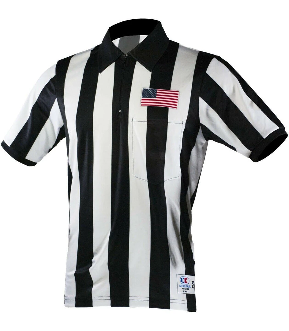 The Cliff Keen Custom Sublimated shirt for H.S. Football officials which is approved by the NFHS. The short sleeve SK062Q features a special 2 1/4″ stripe pattern with wide black side panels. Â Quite simply, you won’t want to ever wear another shirt while officiating!